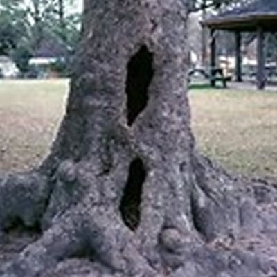 STEP VOLTAGE – Lightning exits an unprotected tree through the roots and lower stem, and dissipates energy into the soil. At the soil surface, a great difference in the electrical potential exists as the charge spreads out. This difference is called ‘step voltage.” If people or animals are standing in the area, a potentially deadly flow of electricity may go up one leg and down the other. On trees with lightning protection systems, step voltage should be greatly reduced but still may occur.